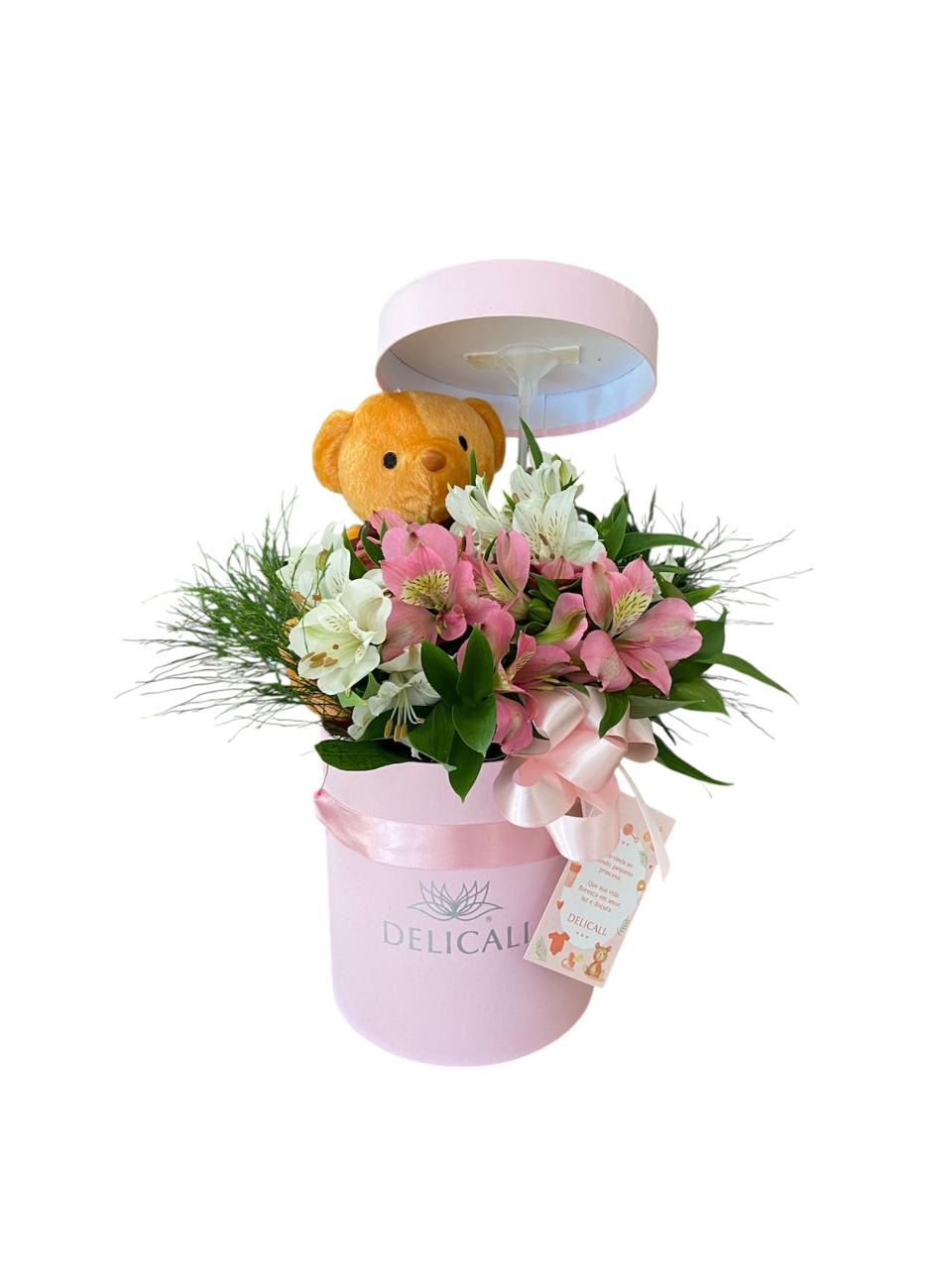 Delicado arranjo, confeccionado com espuma floral, acomodado em uma exclusiva caixa artesanal Delicali, composto por alstroemérias em tons suaves de rosa e amarelo e mix de verdes. O arranjo acompanha um lindo ursinho de pelúcia e por fim, é finalizada com papel celofane e recebe um laço de fita e etiqueta da loja.