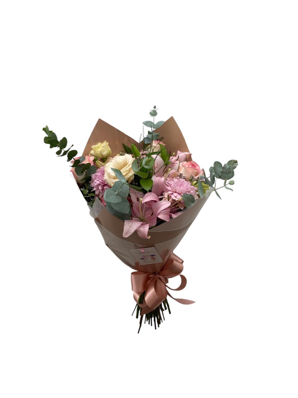 Lindo buquê misto elaborado com duas hastes de lírios cor de rosa, três hastes de lisianthus cor de rosa, quatro rosas cor de rosa, latifolia e mix de verdes, embalado delicadamente com papel especial, laço de fita de cetim e um delicado coração de crochê.