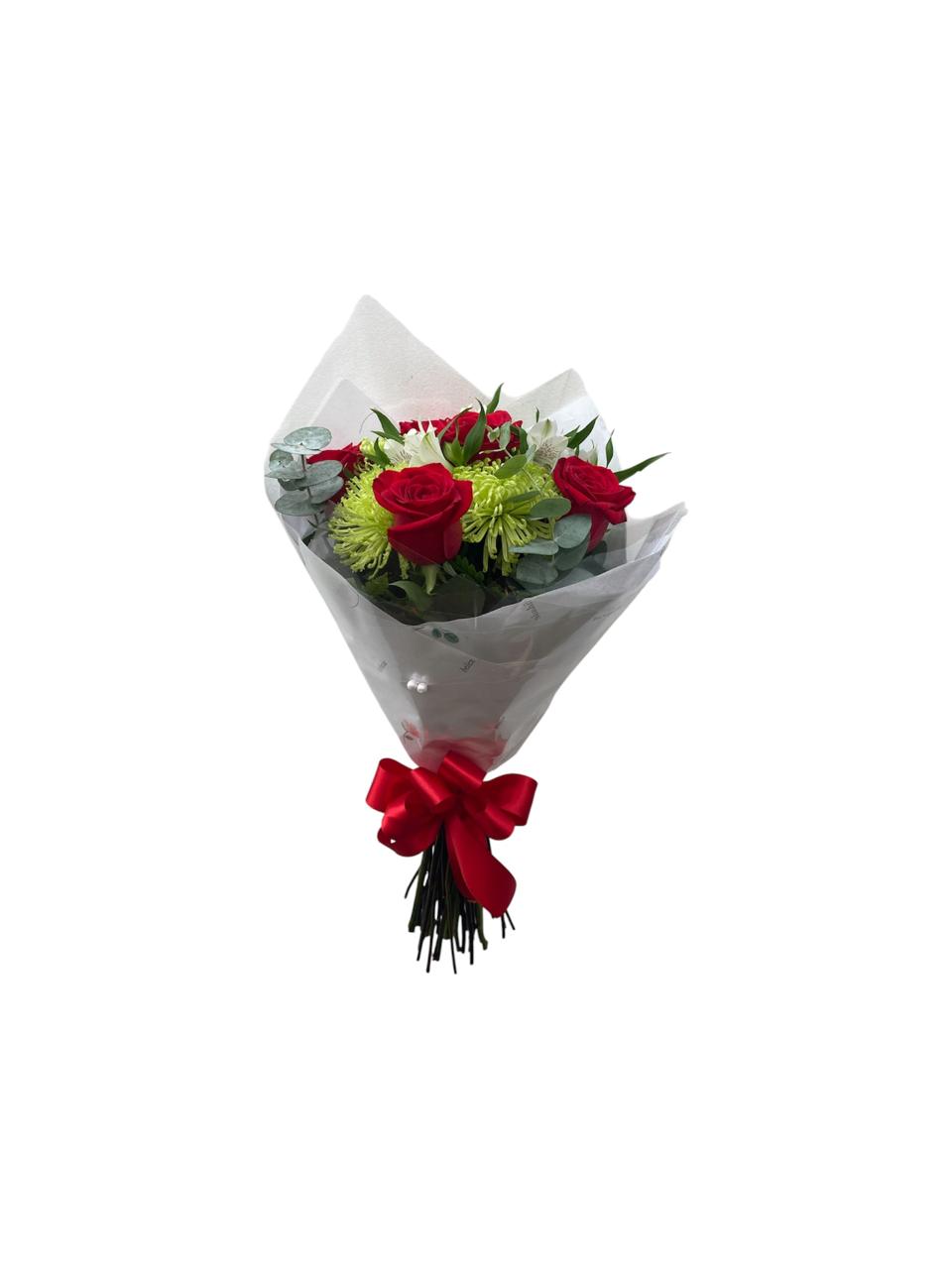 Lindo buquê misto elaborado com cinco rosas importadas, quatro hastes de anastácia, três hastes de alstroemérias e mix de verdes, embalado delicadamente com papel especial, laço de fita de cetim e um delicado coração de crochê.