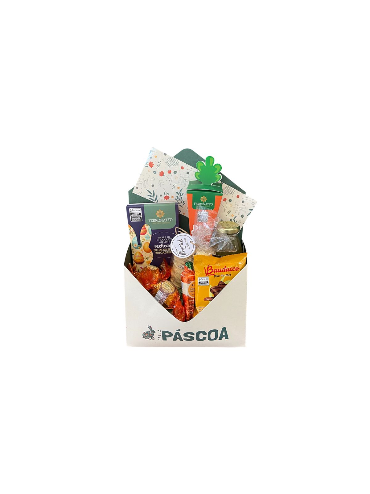 Delicada caixa personalizada em formato de envelope, acompanhada de um pacote de biscoito Minas 80g, um suco Éssere 300ml, um pacote de pão de mel Bauducco 30g, uma caixa de drágeas de chocolate em formato de cenoura Ferronatto 60g, uma cenoura de chocolate ao leite Ferronatto 25g e duas trufas sortidas Ferronatto 30g.