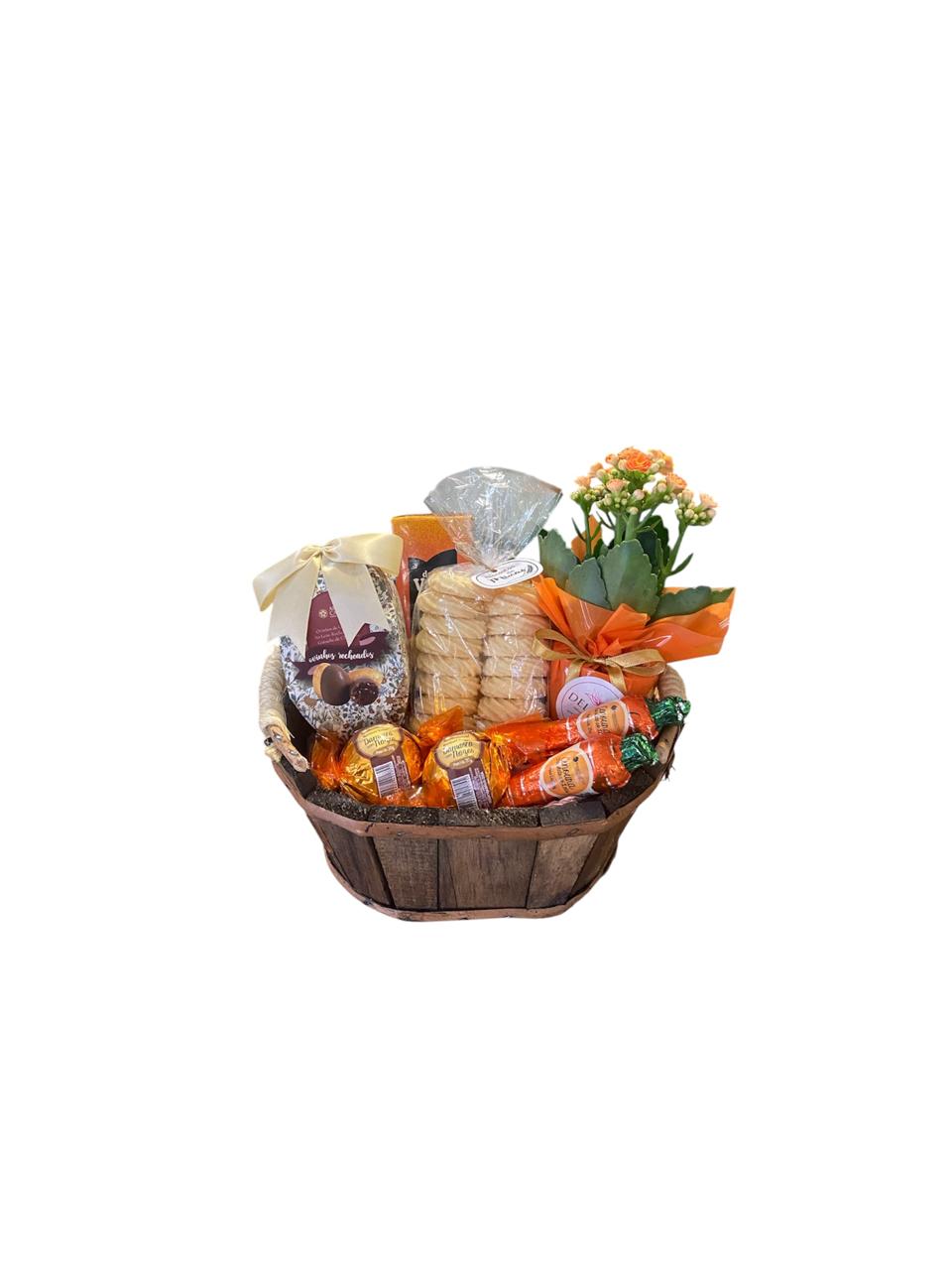 Delicada cesta tina rústica, contendo uma mini kalandiva, um pacote de biscoito Minas 80g, uma caixinha de ovinhos de chocolate ao leite recheados com ganache de chocolate Arte Cacau 75g, um suco de caixinha 200ml, um bolinho Bauducco 40g, duas trufas sortidas Ferronatto 30g e duas deliciosas cenouras de chocolate ao leite Ferronatto 25g.