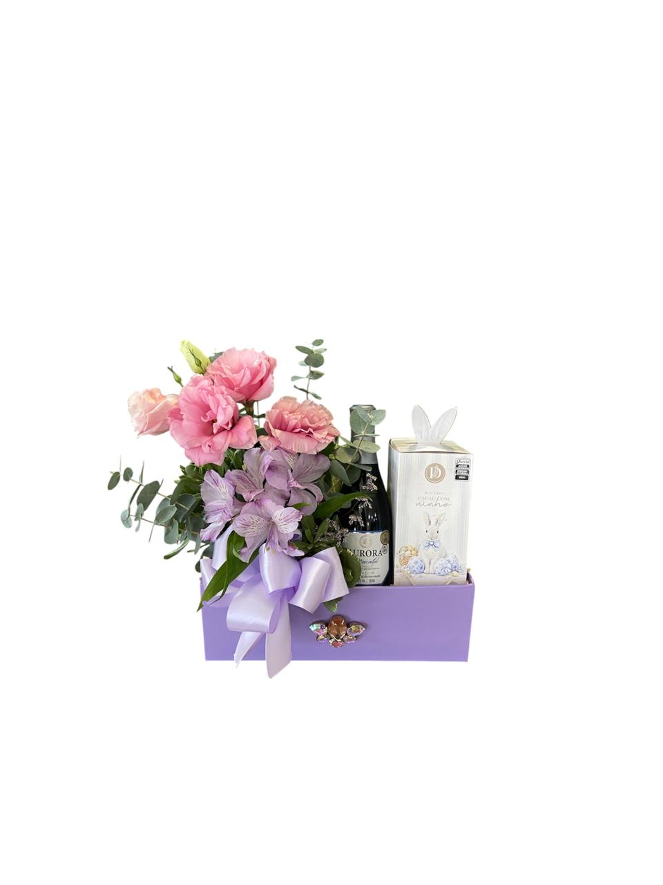 Linda caixa personalizada retangular, acompanhada de um lindo arranjo de flores com lisianthus, alstroemérias e eucalipto. Acompanha também um espumante moscatel Aurora 187ml e uma caixa de biscoitos de cacau com ninho Delicê 120g.