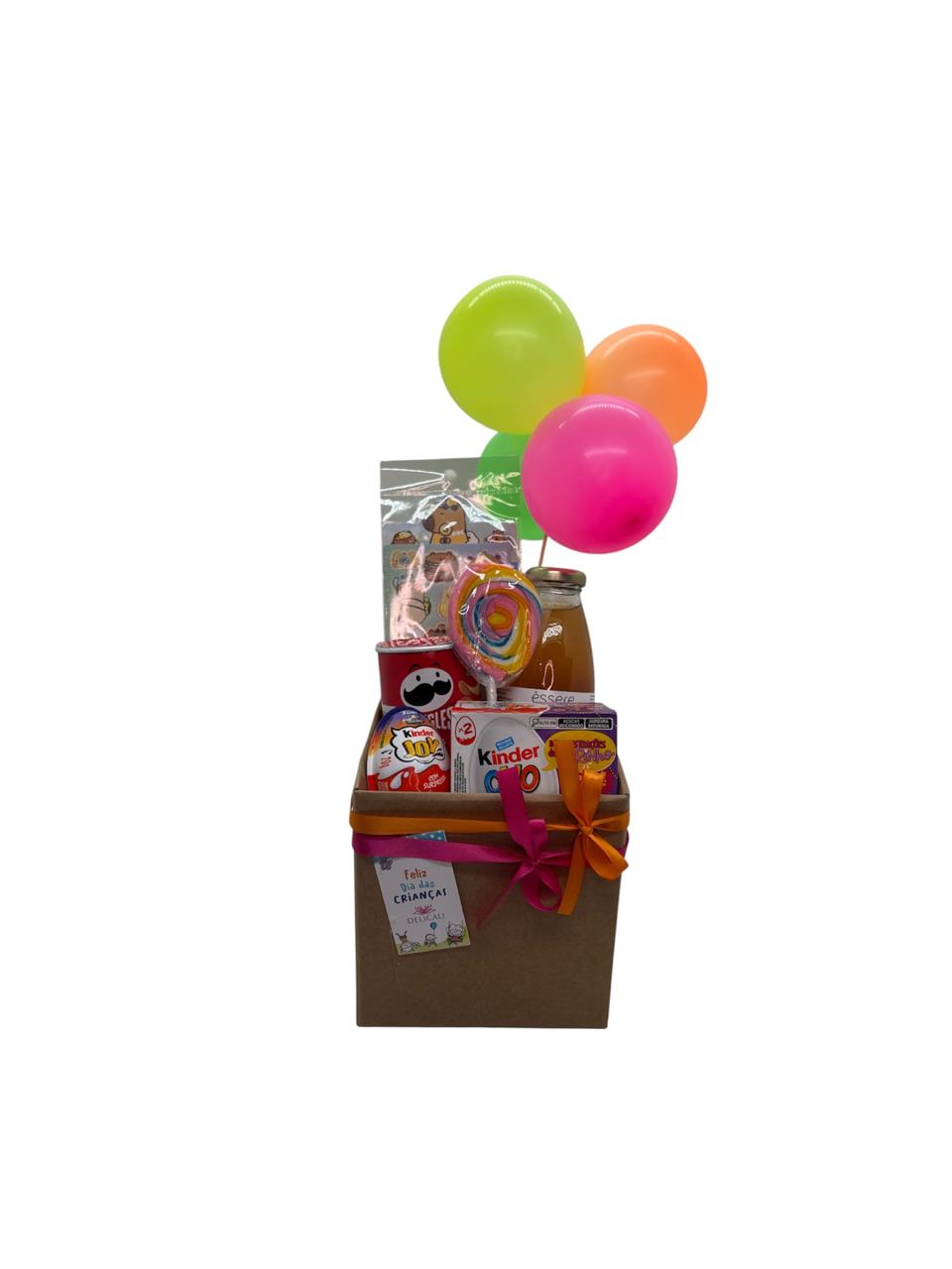 Delicada caixa de papel kraft contendo uma lata de batata Pringles 35gr, um Kinder ovo individual, uma caixa com dois kinder ovo, um suco integral Essere 300ml, um pirulito, uma cartela de adesivos e balões coloridos.