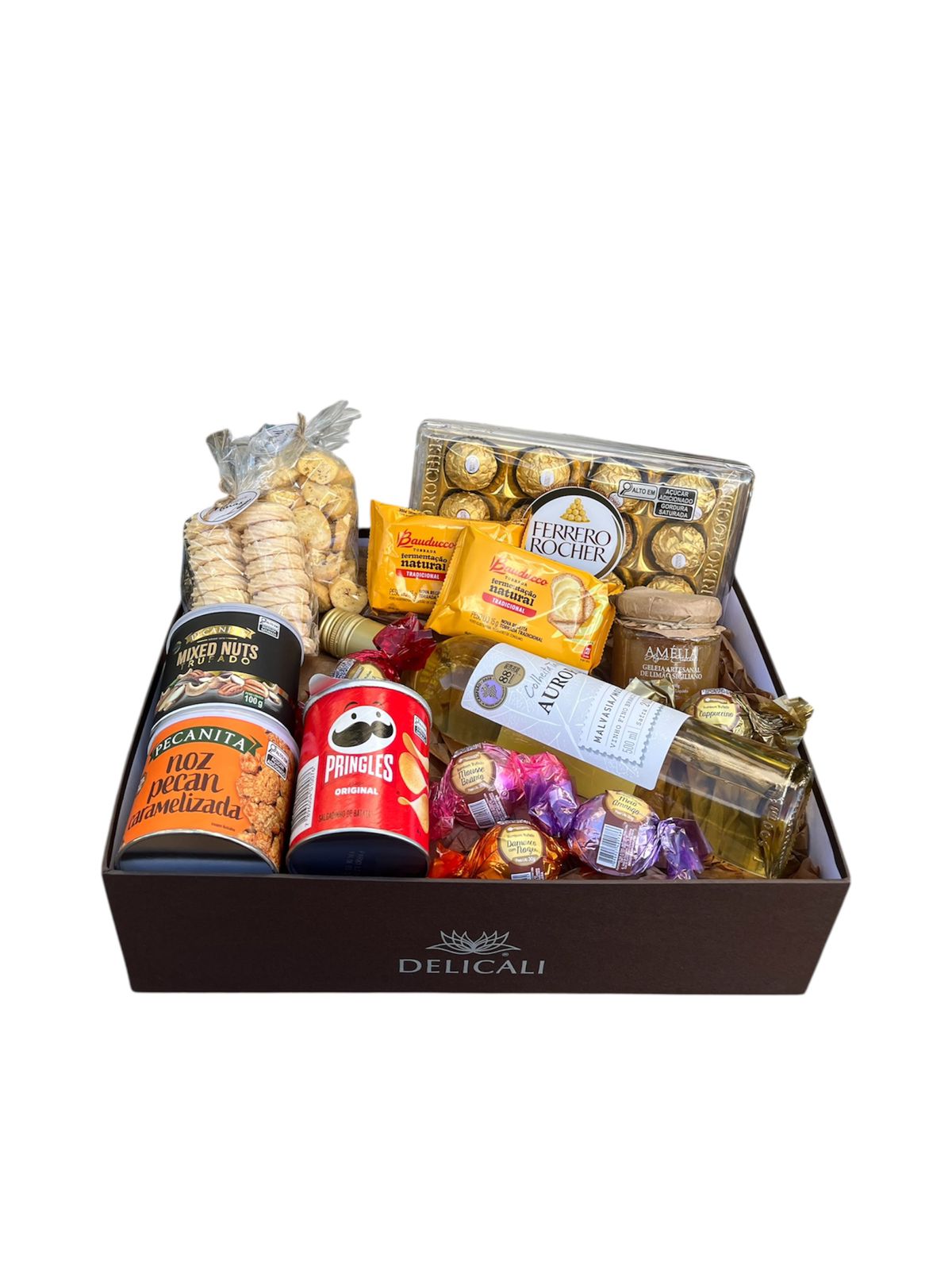 Linda caixa de papel grande com tampa acompanhada de um vinho fino Branco Aurora Colheita Tardia 500ml, uma caixa de Ferrero Rocher 150gr, duas torradas Bauducco 15g, uma lata de mixed nuts Pecanita, uma geléia artesanal de limão siciliano Amélia, uma lata de Noz Pecan caramelizada, uma lata de pringles 35gr, um biscoito de Minas, uma torradinha de Minas e cinco trufas sortidas da Ferronatto 30g.
