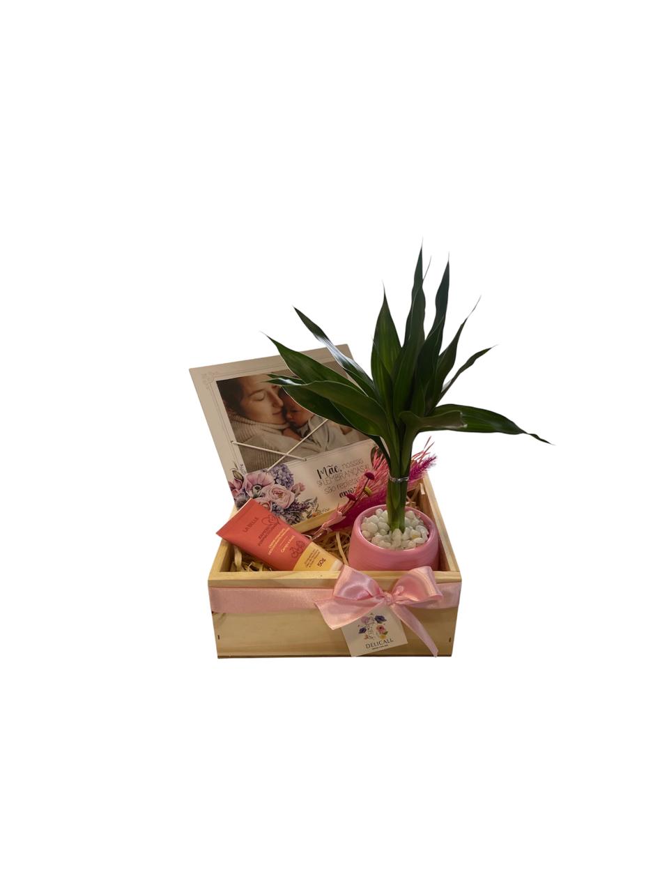 Delicada caixa de madeira contendo um lindo porta retrato, uma folhagem bambu da sorte e um creme para mãos Labelle 50gr.