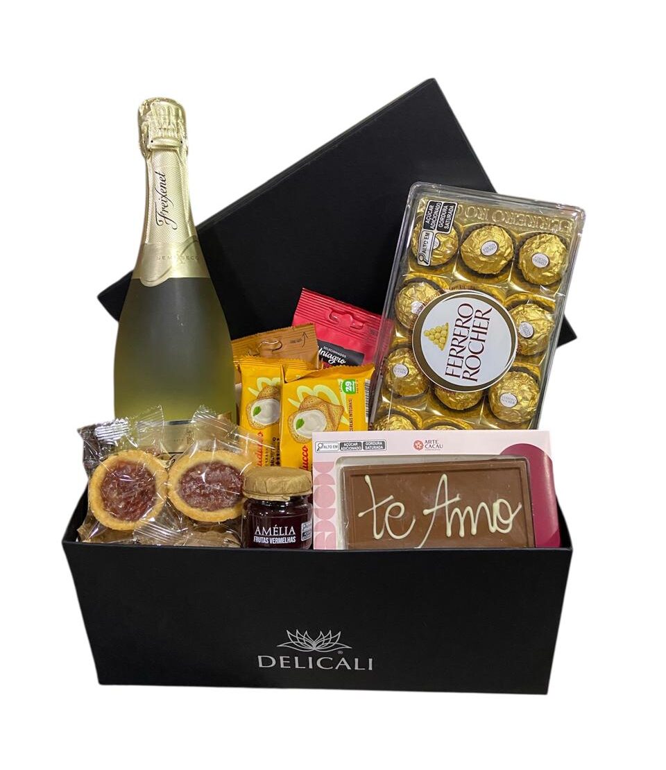 Linda caixa artesanal contendo uma espumante Freixenet Carta Nevada 750ml, uma caixa de bombons Ferrero Rocher 150gr, uma barra de chocolate ao leite Arte Cacau 40gr com a mensagem de Te amo, um sachê de Castanha de Cajú Uniagro 30gr, um sachê de Hot Mix Uniagro 30gr, dois Crostatine Frutas Vermelhas, um pote de geléia artesanal Amélia 45gr e dois pacotes de Torradas Bauducco 15gr.