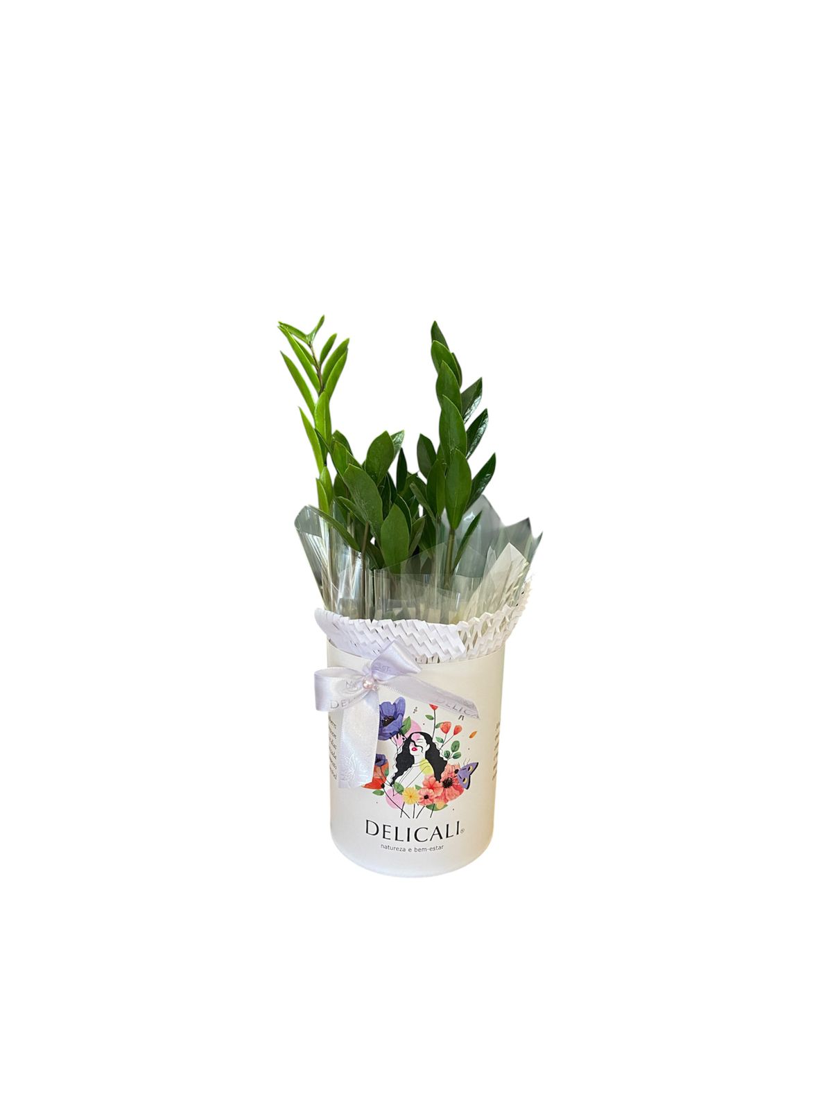 Linda zamioculca pequena decorada em um cachepô personalizado para o dia da mulher com um laço de fita.