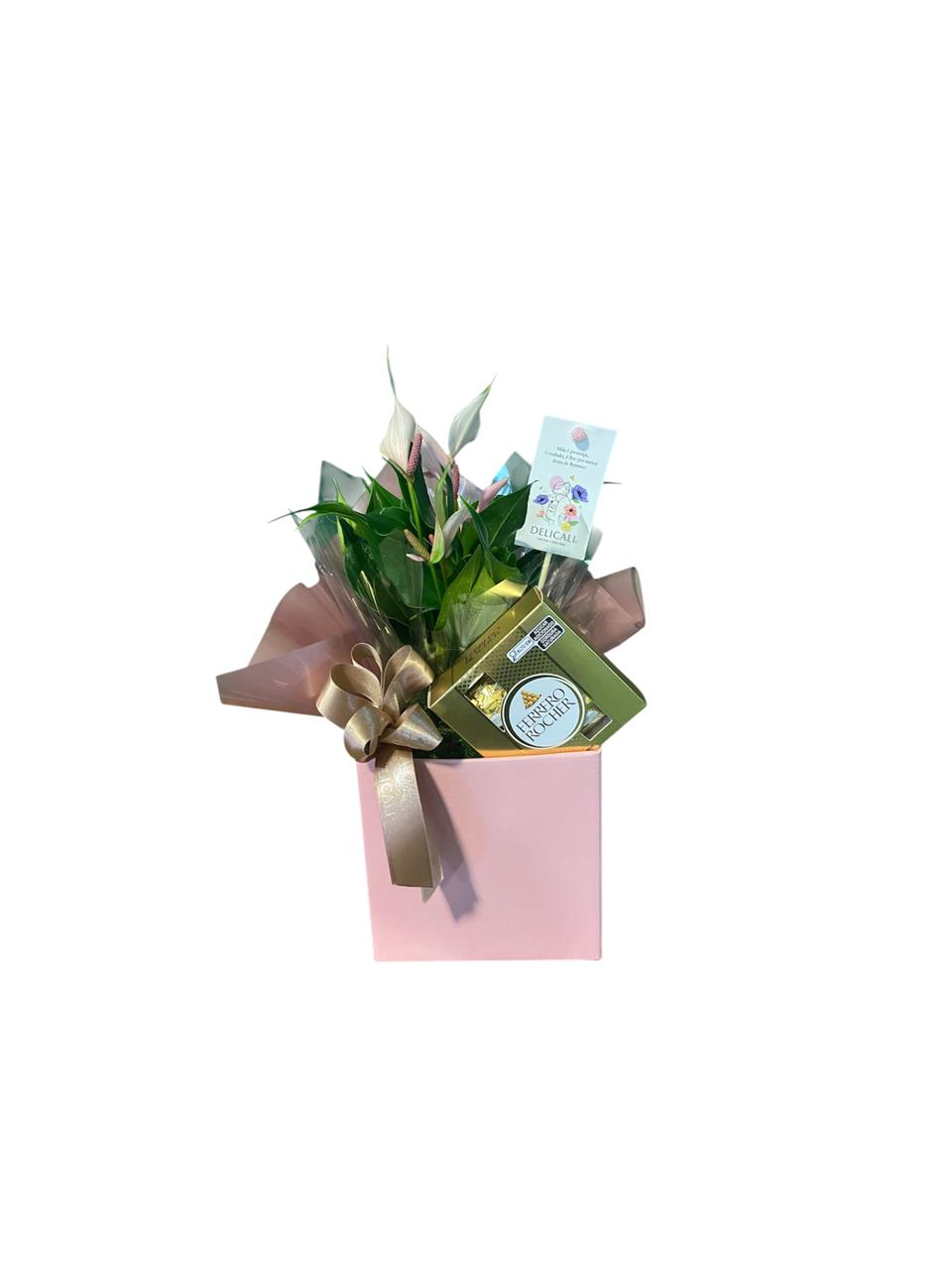 Delicado cachepô de papel com um lindo antúrio decorado e uma caixa de Ferrero Rocher 50gr.
