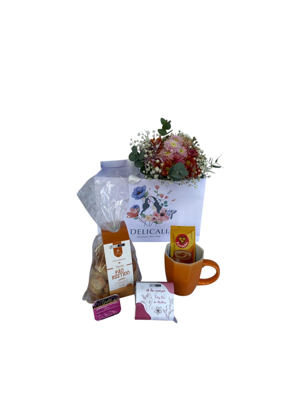 Linda sacola de papel personalizada para o dia da mulher contendo um delicado mini buquê de flores do campo, uma caneca, um capuccino, um sachê de açúcar, um pacote de pão de mel recheado com doce de leite 55gr, uma mini geléia e um pacote de pão rústico Delicê 100gr.