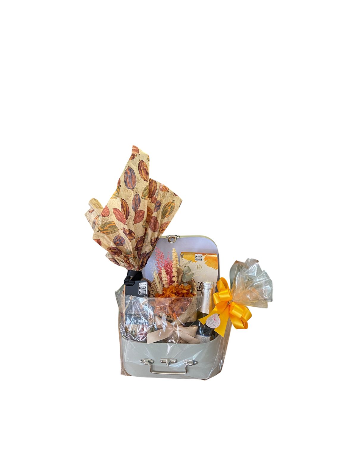 Linda maleta acompanhada de um ovo de chocolate ao leite Ferronatto 370g, um espumante moscatel Aurora 187ml, uma caixa de pães de mel Delicê 130g e um delicado arranjo misto de flores secas.