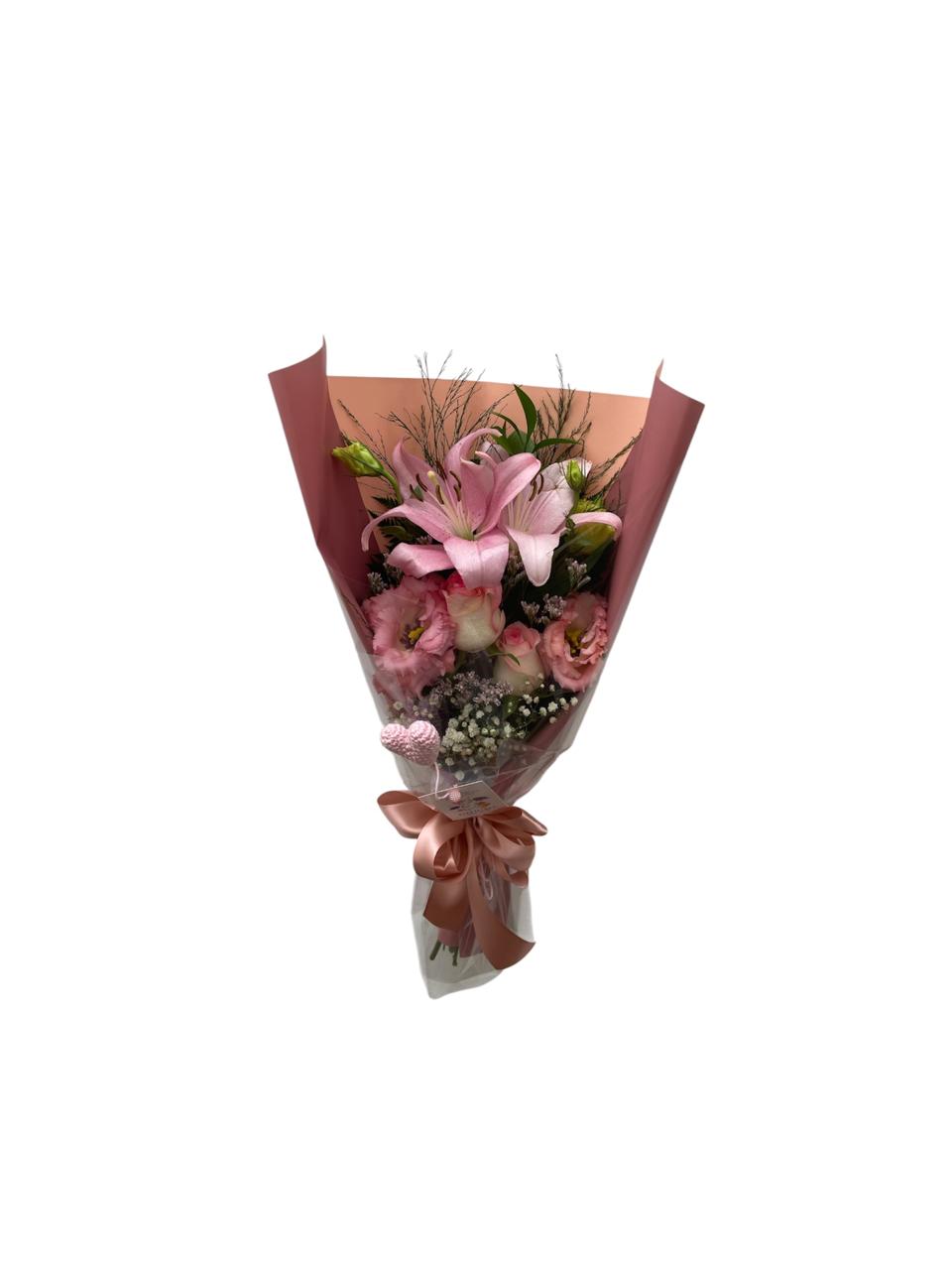 Elegante ramalhete elaborado com uma haste de lírio cor de rosa, duas hastes de lisianthus, duas rosas cor de rosa, latifolia e mix de verdes, embalado delicadamente com papel especial e laço de fita de cetim.