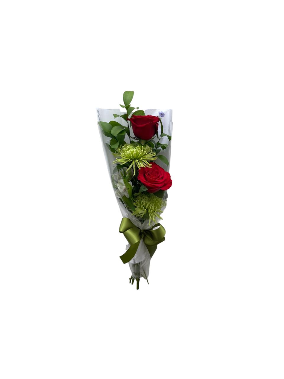 Elegante ramalhete elaborado com duas hastes de rosa importada, duas hastes de anastácia, uma haste alstroeméria e verdes, embalado delicadamente com papel especial elaço de fita de cetim.