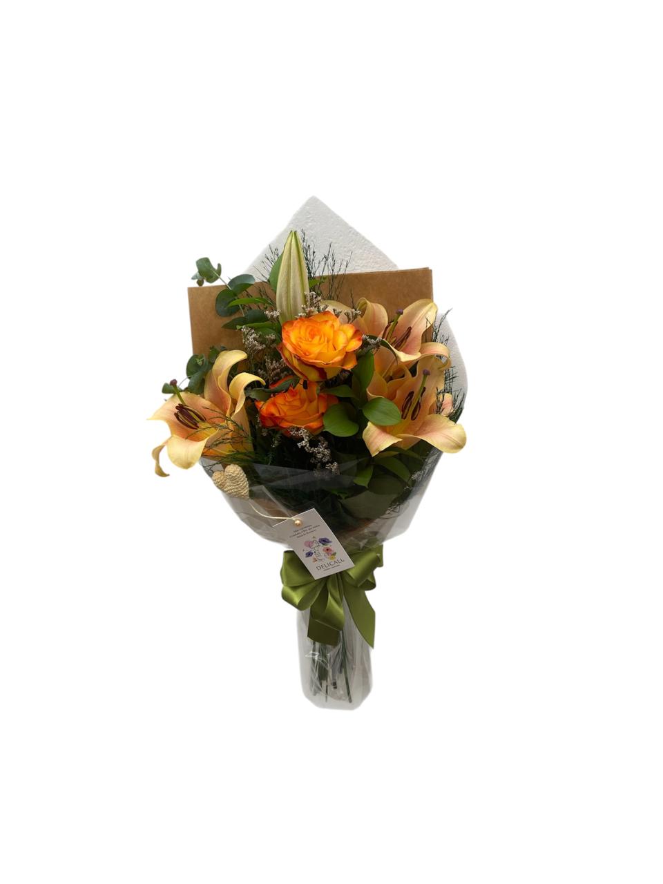 Elegante ramalhete elaborado com uma haste de lírio cor chá, duas rosas bicolor, latifolia, mix de verdes, embalado delicadamente com papel especial, laço de fita de cetim e um delicado coração de crochê.