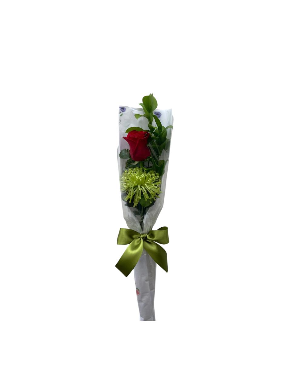 Delicada rosa importada decorada com uma anastácia e verde, embalada com papel e um laço de fita de cetim.