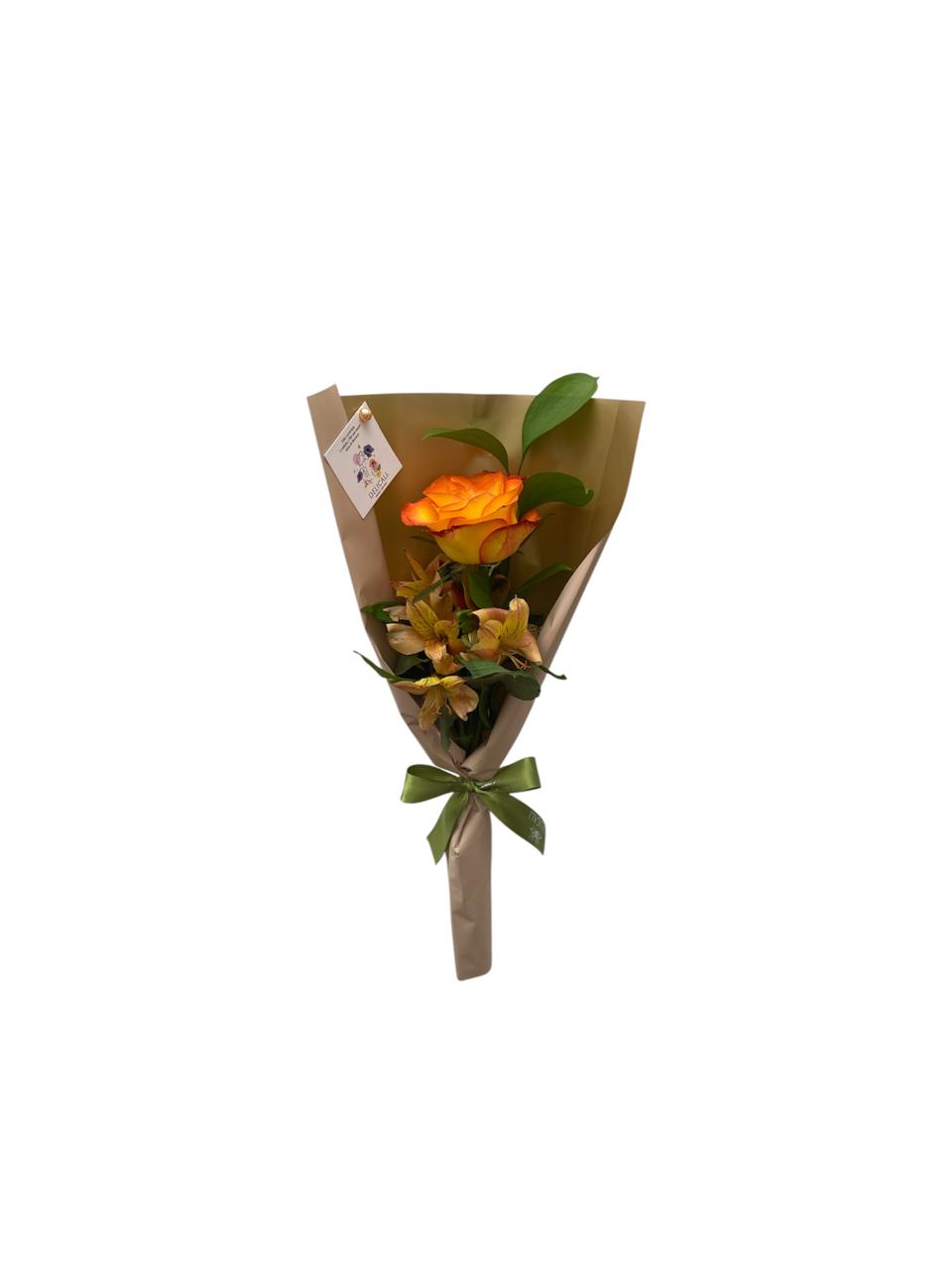 Delicada rosa decorada com uma alstroemeria e verdes, delicadamente embalada em papel especial e um laço de cetim.